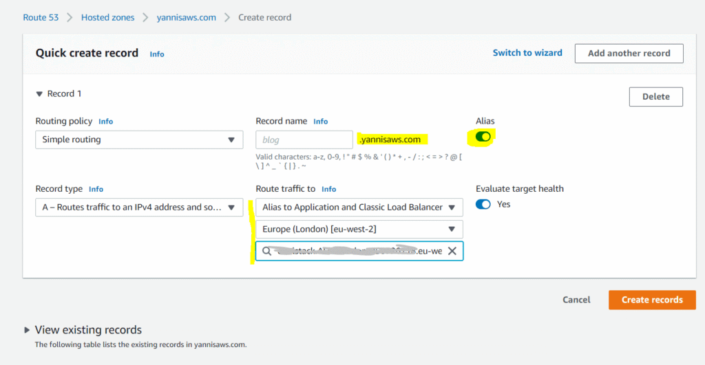 Then you only have to use your registered domain name instead of the long and difficult to remember DNS name of the ALB. Let me show you how you can add an alias Route53 record:
