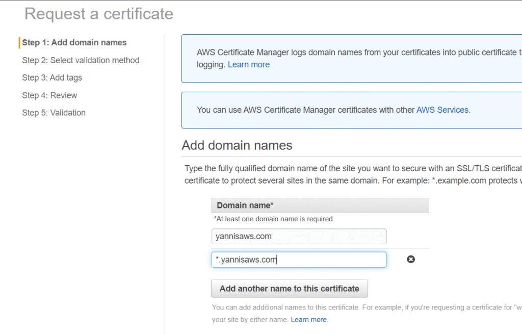 Go to AWS Certificate Manager service and click “Request Certificate“, then public.